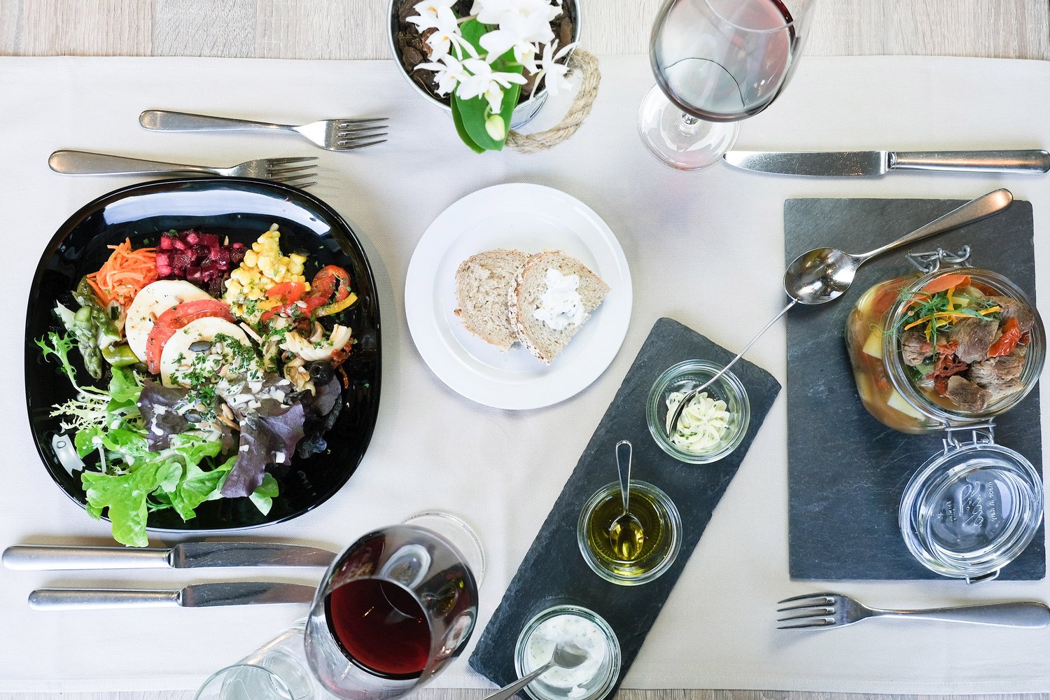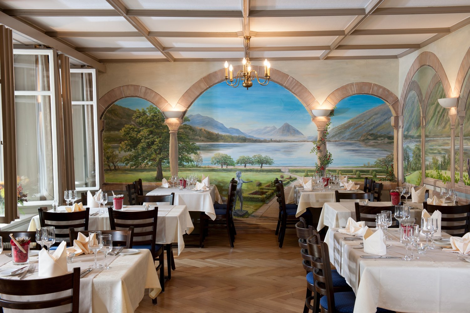Gruppen können im Restaurant oder der Loggia gemeinsam speisen.